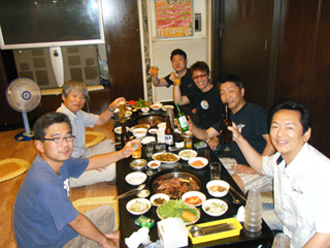 ![]() 韓国の話しの前に コレでしょ! いやぁ〜早起きした甲斐があったよ!! なんだかんだ言って本田選手はイイよね。 (でも松井選手が好き) フリーキックも見事だが、3点目のアシストがすんばらしい! 欲を言えば、もうちょっと声が低いといいかな・・・と。(サッカーとは無関係) にわか評論家になるつもりは無いけど、皆さんの職場では”語ってる” 評論家でいっぱいだろうな(笑)。 とにかくおめでとう! 侍たち! (寝不足万歳!) さてと・・韓国の話しに戻るか。 ![]() 韓国最後の晩餐も モチロン焼肉。 チョイさんともすっかり友達になり、「今日は早く帰ります・・」と 言っていたが、飲んだら帰りたくなくなって、結局最後まで お付き合いしてくれた。 韓国人にもいるんだな・・・斉藤みたいな人(笑)。 ![]() ![]() タン塩もウマかったが、チヂミが絶品! 肉系は日本とどっこいかそれ以下だが チヂミは、まず日本では 食べれない味。 生地の違いか油の違いかは分からないが、とにかくウマイ! ![]() お店のおばちゃんと記念撮影。 すでに上機嫌なオイラ達とは対照的に、少し”引いてる”おばちゃん(笑)。